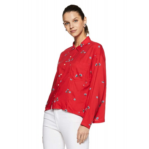 Styled shirt in red with floral print color. Perfect for your on-the-go life; this shirt makes outfitting easier then ever.